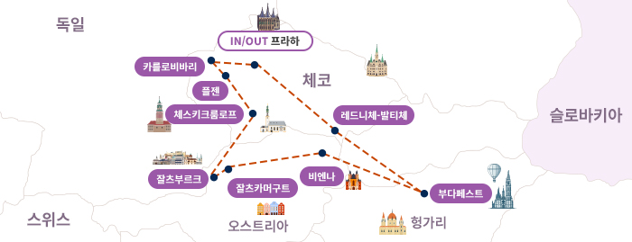 인천-프라하(1)-카를로비바리-플젠(1)-체스키크롬로프-잘츠부르크(1)-잘츠카머구트-비엔나(2)-부다페스트(1)-레드니체-발티체-프라하(1)-기내(1)-인천