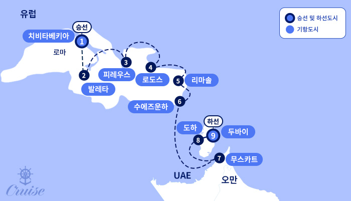 인천 - 두바이 - 로마 치비타베키아(1) 승선[이탈리아] ▶ 발레타 [몰타] ▶ 피레우스 [그리스] ▶ 로도스 [그리스] ▶ 리마솔 [키프로스] ▶ 수에즈운하 통과 [이집트] ▶ 무스카트 [오만] ▶ 도하 [카타르] ▶ 두바이 [아랍에미리트] 하선 -인천